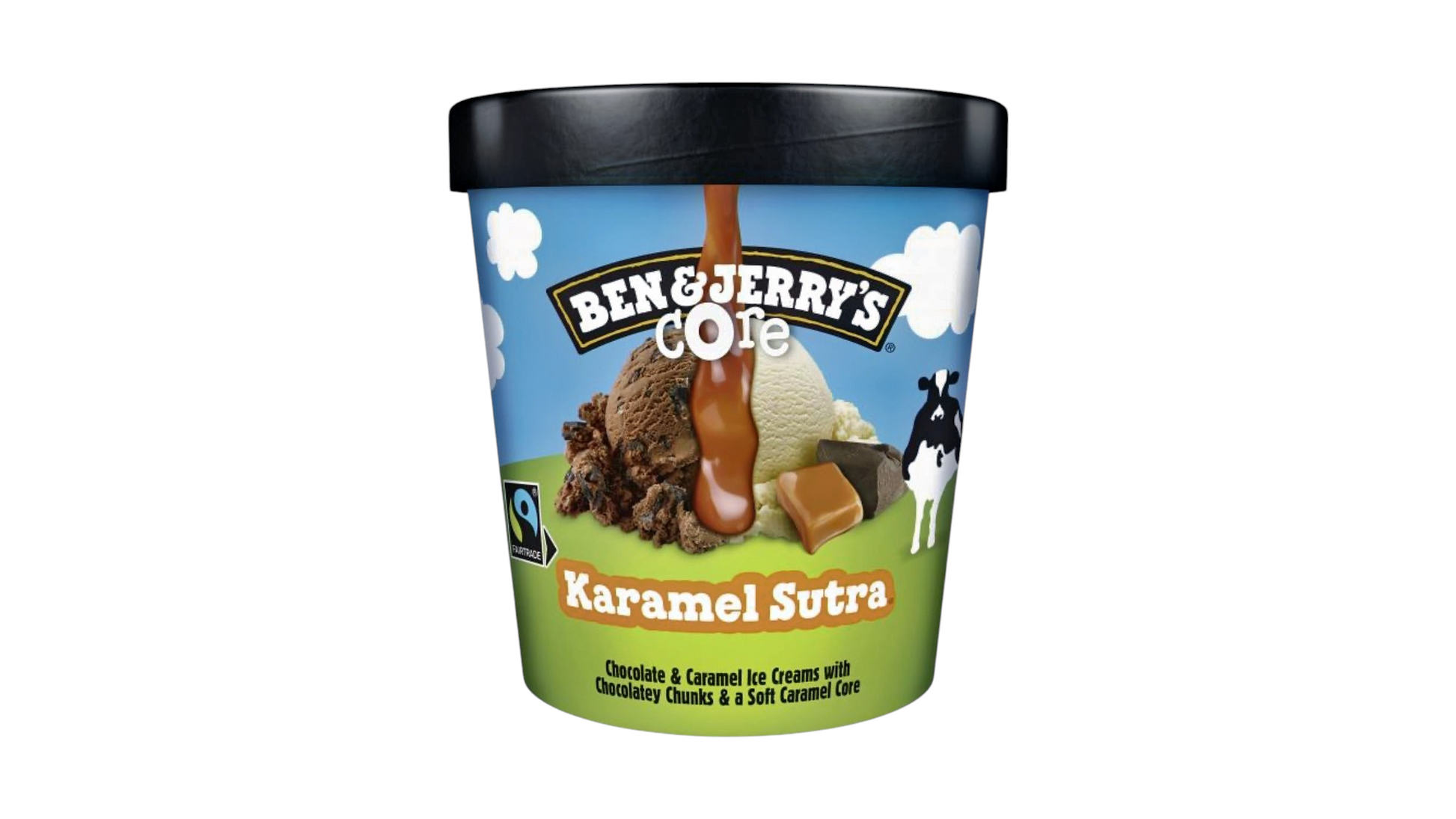 Karamell- und Schokoladeneis mit weichem Karamellkern, knusprigen Kakaostückchen und einer Mischung aus Karamell- und Schokoladeneis. Es ist ein köstliches und fair gehandeltes Dessert mit Fairtrade-Zertifikat und Zutaten aus verantwortungsvollen Quellen. Die Verpackung besteht aus recycelbaren Materialien.