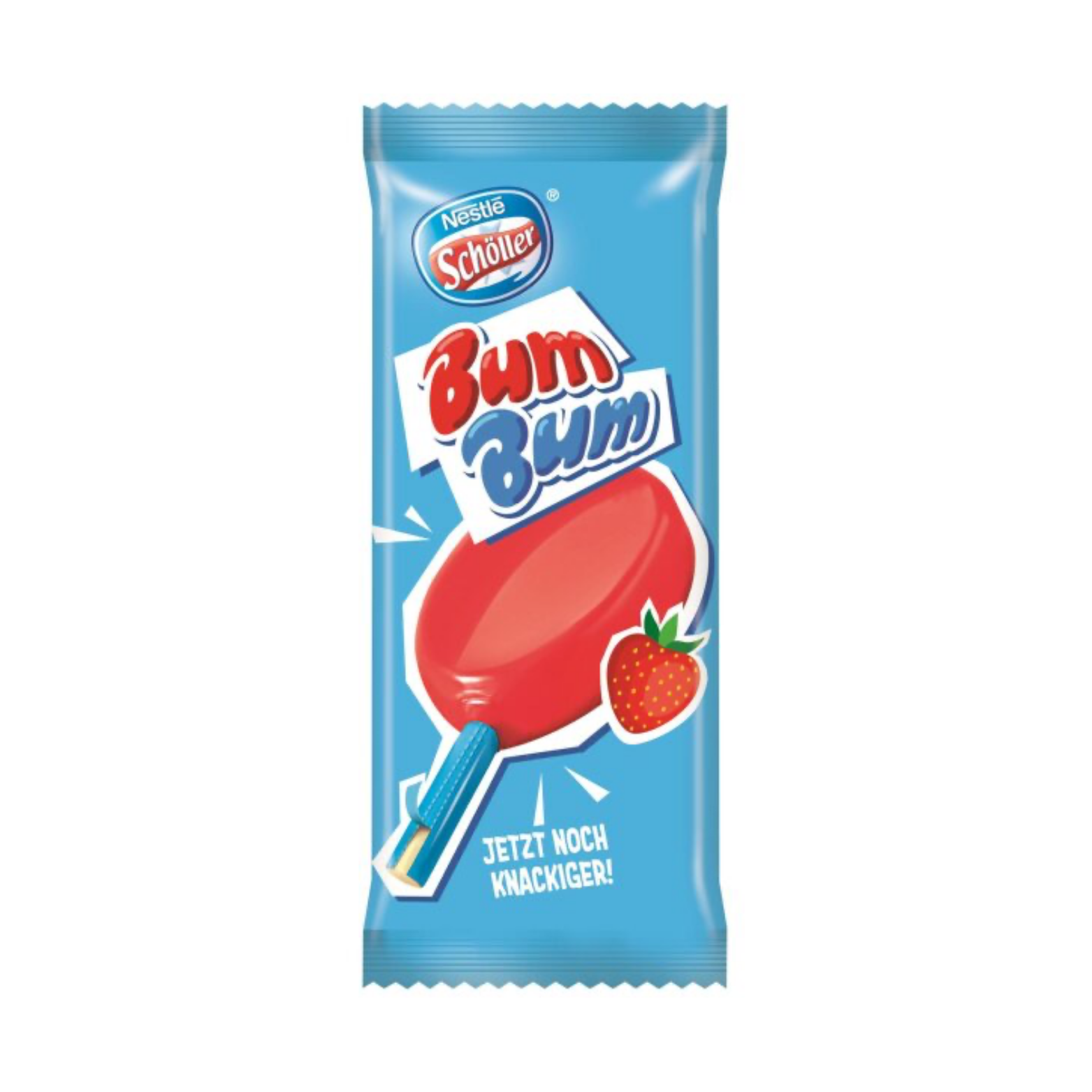 Milcheis mit Vanille- und Erdbeergeschmack, überzogen mit einer roten Schicht Fruchtzuckerglasur. Nach dem Verzehr bleibt ein Kaugummistück übrig, das zum Schutz in einer blauen, perforierten Plastikhülle steckt – ein unverwechselbares und verspieltes Element.