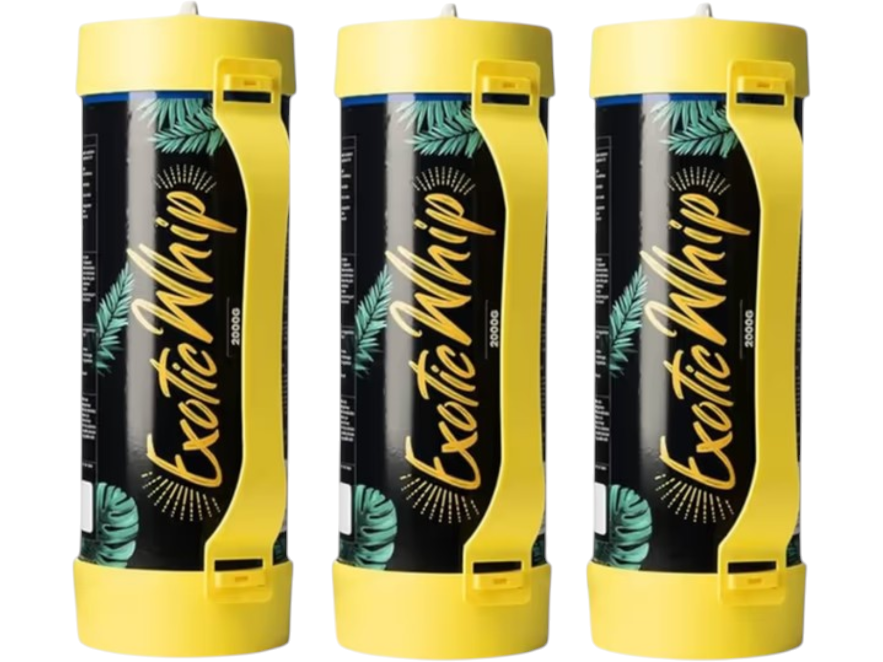 Der Exotic Whip 2kg 3x  ist ein professioneller n2o-Whipped-Cream-Charger mit einer Kapazität von 2000 Gramm, ideal für Gastronomiebetriebe und Events. Er ermöglicht etwa 250 Füllungen eines Whipped-Cream-Dispeners und bietet eine hohe Gasreinheit von 99,95 %.