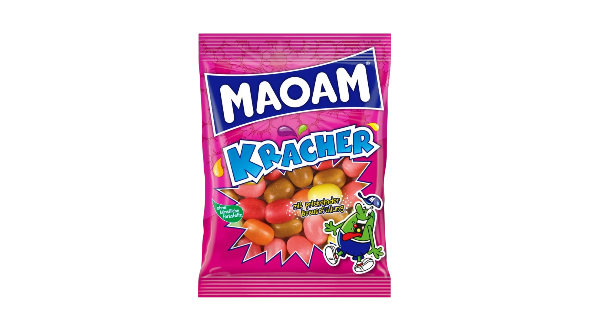 Maoam Kracher bieten einen fruchtig-knackigen Kaugenuss mit dem besonderen Etwas. Denn die Kaubonbons überzeugen mit dem Geschmack von Orange, Erdbeere, Apfel, Zitrone, Himbeere und Cola und bieten darüber hinaus eine feste Drageehülle, die erst einmal durchbissen werden möchte, bevor sich der prickelnde Kern mit der Brausefüllung offenbart.